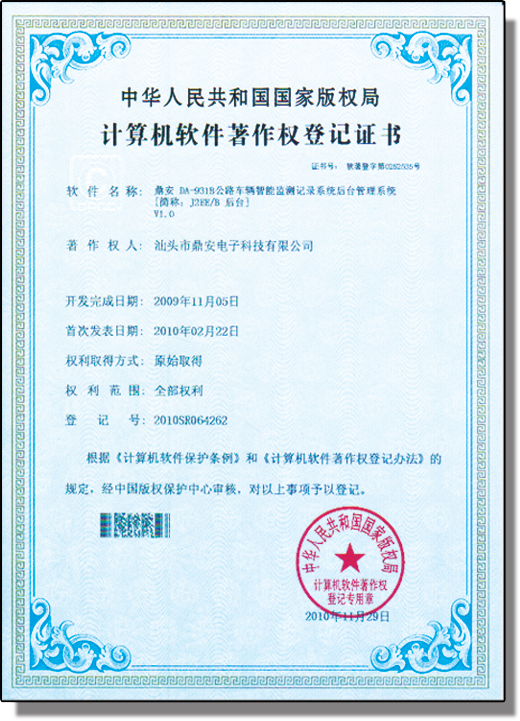 DA-931后平臺數(shù)據(jù)管理系統(tǒng)嚴格按照GA/T 497-2009《公路車輛智能監(jiān)測記錄系統(tǒng)通用技術條件》、《廣東省治安卡口視頻監(jiān)控系統(tǒng)建設規(guī)范》、GA/T 496–2009《闖紅燈自動記錄系統(tǒng)通用技術條件》等相關公共安全行業(yè)標準,對整個系統(tǒng)建設進行了詳細規(guī)劃設計,充分體現(xiàn)出安全、實用、合理、易維護等特點。該系統(tǒng)已得到國家版權局計算機軟件著作登記權證書(軟著登字第0252535號)。